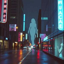 Cyberpunk ambient, neon night rain, ethereal female whispers, deep pads, wide stereo, no drums