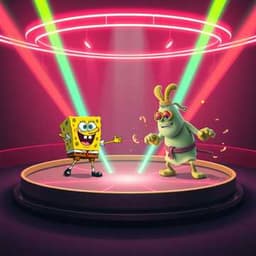 rap, High-energy electro-rap cypher, bouncy synth bass and elastic leads. Verses trade off in a cartoon showdown, tight drums with glitchy fills. Hook explodes with gang vocals and pitched chants, brief half-time switch in the bridge for impact, then back to full-throttle for the final chorus. Male vocals with playful character deliveries and ad-libs., electro