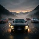 . Rain hammering the road. Deep V8 engines rumbling. Headlights slowly ignite in the fog. At the front sits a black 1970 Ford Mustang Boss 302. The hood shakes as the V8 snarls through open pipes. BLAP. POP. POP. Flames spit from the exhaust. Around it are other outlaw machines: • A brutal 1969 Dodge Charger R/T idling like thunder. • A screaming 1969 Pontiac GTO shaking the pavement. • A fire-red 1977 Pontiac Firebird Trans Am with the engine revving hard. • A white 1967 Shelby GT500 growling beside them. Drivers sit quietly, staring at the road ahead. The mountain pass drops into darkness. 15 savage hairpins. A racer lights a flare. Green light burns in the rain. RACER Run the mountain. He drops the flare. ⸻ SCENE 2 — THE LAUNCH All the cars explode forward. SFX: Roaring V8 engines shaking the forest. The Boss 302 Mustang rockets into the first corner. The Charger lunges beside it. The GTO spins the tires wildly, throwing water across the road. Lightning flashes across the mountains of Angeles National Forest. ⸻ SCENE 3 — THE FIRST HAIRPINS Hairpin #1. The Mustang slides sideways in a violent drift. Hairpin #2. The Charger powers through with raw torque. Hairpin #3. The Firebird Trans Am drifts wide, tires screaming on wet asphalt. Hairpin #4. The Shelby GT500 roars out of the turn like a missile. Exhaust cracks echo through the storm. BLAP POP POP Flames burst from several muscle cars. ⸻ SCENE 4 — THE WATCHERS High above the road, animals watch the storm. A massive American black bear stands near the tree line, staring at the roaring machines. Further up the cliffs, a Cougar crouches silently on a rock. Lightning lights the mountains. The race tears past them. ⸻ SCENE 5 — MID-MOUNTAIN CHAOS Hairpins 7 through 12. Cars sliding through rain and darkness. The Charger nearly hits the guardrail. The Firebird drifts perfectly through a tight switchback. The GTO roars past another corner with tires spinning. But the Boss 302 stays ahead. The V8 screams through the storm. ⸻ SCENE 6 — FINAL HAIRPINS Hairpin 13. The Shelby GT500 lunges forward trying to pass. Hairpin 14. Two Mustangs drift together through the rain. Hairpin 15. The Boss 302 throws one final perfect slide through the corner. The driver floors it. The V8 roars. The Mustang blasts down the final straight into darkness. ⸻ SCENE 7 — THE LEGEND The mountain grows quiet again. Rain falls through the forest. The bear slowly disappears into the trees. Far away through the storm… The sound echoes across the California mountains. A wild V8 screaming through the night. ⸻ NARRATOR (V.O.) They say when the storms hit the California mountains… You can still hear them. The outlaw muscle cars of the night. Still racing the hairpins. Still chasing thunder.