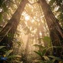 Wide stereo rainforest field recording bed: layered streams, distant thunder rolls, cicadas and birds circling the spectrum. Warm, dusty lo-fi groove slides in under the canopy with soft sidechained pads, round sub, and brushed snare. Occasional pitched percussion and glassy plucks echo like droplets; energy swells gently then ebbs, ideal looping structure with a subtle tape-warp outro., lo-fi, ambient