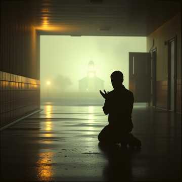 country, Brooding dark gospel-country hybrid with male vocals; low tremolo guitars and upright bass under a slow, stomping drum feel. Big church choir answers the lead in the hook, with organ and strings swelling on every mention of faith and light. Verses stay intimate—raspy baritone close to the mic—then the chorus explodes with orchestral brass and layered harmonies, ending on a long, ringing chord and fading choir hum., guidance, light, gospel, orchestral, male vocals, strong